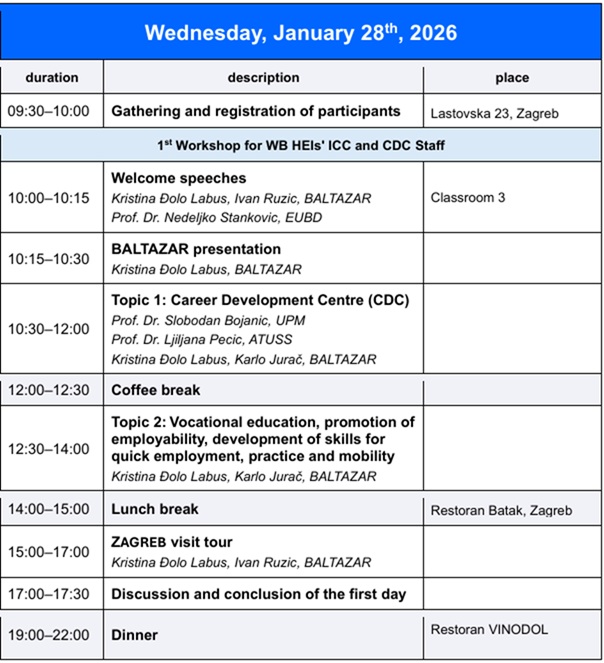 The first day focused on the exchange of good practices in the fields of career development, employability, internships, and student mobility, including a presentation of the host institution’s work Baltazar Zaprešić University of Applied Sciences.