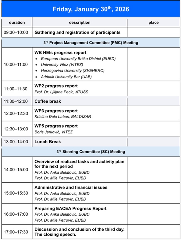 The final day was dedicated to the 3rd meeting of the Project Management Committee and the Steering Committee, where reports on the progress of work packages, partner institution activities, and plans for the upcoming period were presented.